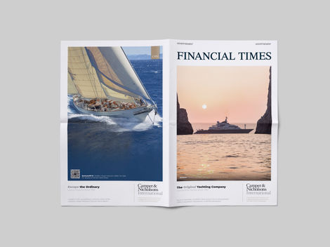 In addition to the core templates, a special four-page cover wrap was designed for the Financial Times, a high-impact format that combined editorial elegance with strong brand presence. The overall style is clean, sophisticated, and aligned with Camper & Nicholsons’ legacy as a world leader in luxury yachting, highlighting key messages with refined typography, ample white space, and striking imagery.